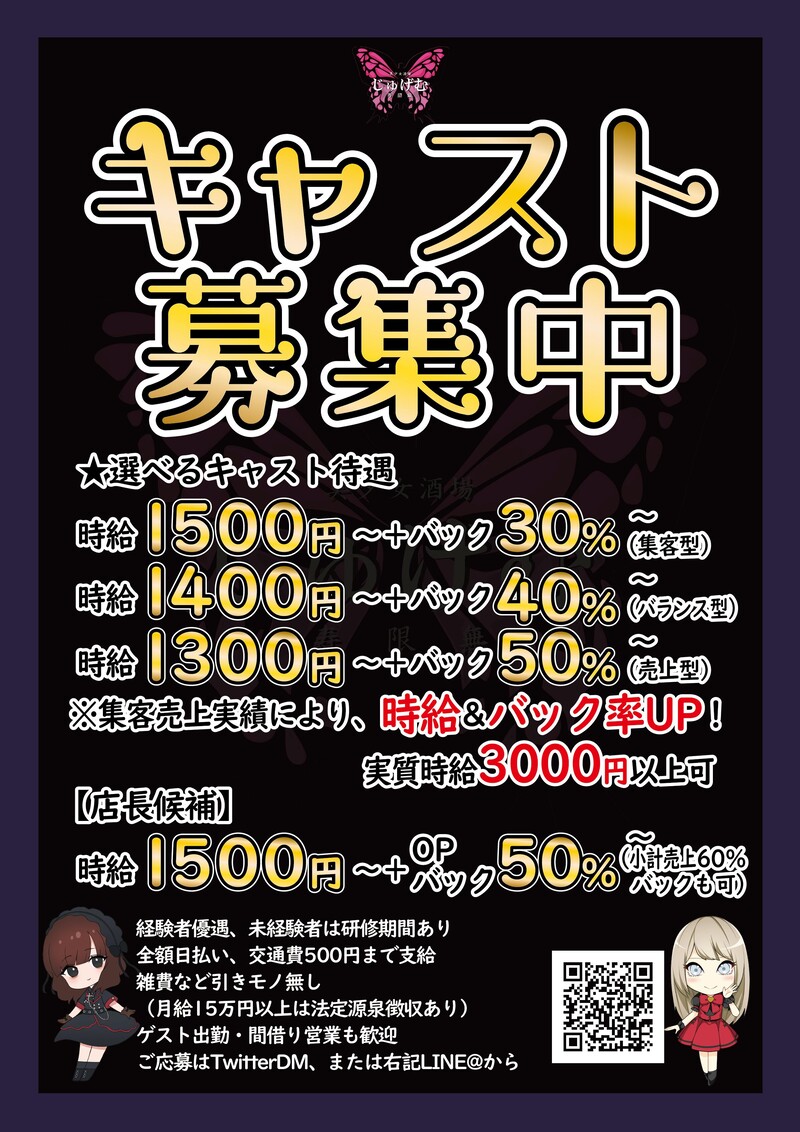 4番出口から徒歩2分勤務時間 平日19時~6時 土日祝日18時~6時 ※最低3時間から出勤可能