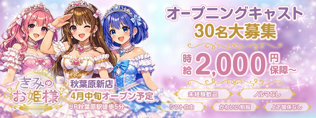 時 給 2,000円以上 勤 務 地 銀座線末広町駅徒歩1分 JR秋葉原駅徒歩5分勤務時間 17時〜24時の間で自由シフト 定休日無し 【オープニングキャスト募集】 秋葉原に新しくオープンする コンセプトカフェ **「きみのお姫様」**です👑 お客様に大切にされる “お姫様”をテーマにしたお店で 一緒に働いてくれるキャストを募集しています。 オープニングスタッフなので 上下関係や派閥は一切ありません。 みんな同じスタートなので 未経験の方でも安心して始められます。 【お仕事内容】 お客様をお迎えして ・ドリンクやフードの提供 ・楽しいおしゃべり ・簡単な店内業務 などをお願いします。 難しいお仕事はないので コンカフェ未経験の方でも大丈夫です。 スタッフが丁寧にサポートします✨ 【こんな方におすすめ】 ・コンカフェで働いてみたい ・かわいい制服のお店で働きたい ・新しいお店でスタートしたい ・人間関係が良いお店で働きたい そんな方をお待ちしています。 【お店の特徴】 👑オープニングスタッフ 👑経験者優遇 👑未経験OK 👑ノルマなし 👑上下関係なし 👑かわいい制服 👑シフト自由 【応募方法】 質問だけでも大歓迎です✨ お気軽にご応募ください