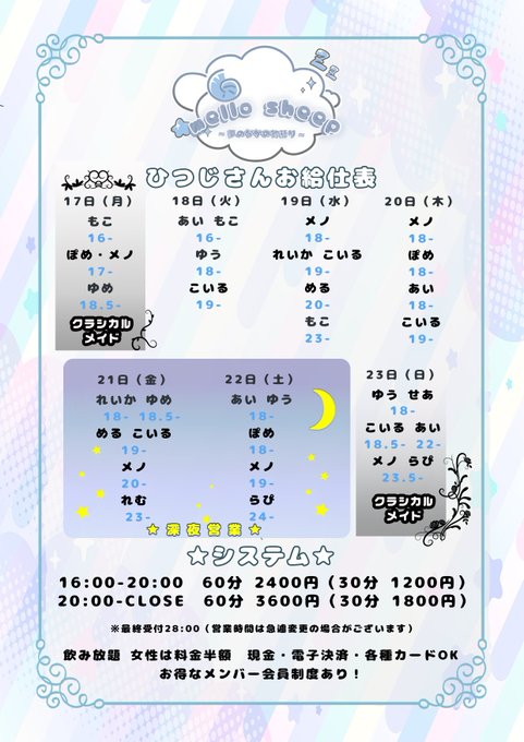 | 勤務時間 | 16時〜29時 土日・祝日 出られる方大歓迎!!! |