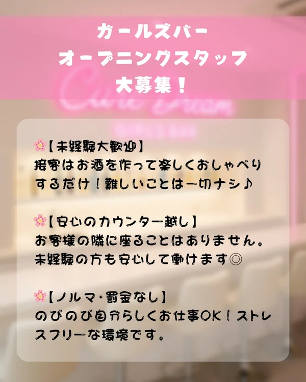 要項 企業情報 募集要項 仕事内容 職務内容 ========== ≪ネコ×カワイイ≫が イッパイ詰まったお店 ========== お客様と楽しくお話しながら お酒を作るだけの簡単なお仕事です! ▼▼具体的には…▼▼ ■ カワイイ制服を着ます ■ お客さんと楽しくお話 ■ ドリンクを作って提供 など 女性店長も在籍してるので 日頃の相談や仕事の相談も聞いてくれます! 求める人材 ・未経験者OK ・経験者優遇 ・学生OK ・OLさんOK ・Wワーク希望の方OK 【こんな方が活躍しています!】 アパレル、カフェ、ファストフード、居酒屋、コンビニ、 バーテンダー、ホール/キッチンスタッフ、イベントスタッフ、 キャバクラ、スナック、ガールズバー、コンカフェ、 メイド喫茶、美容師、ヘアメイク、ネイリスト… などなど、 様々な職種経験者さんが活躍中♪ アピールポイント 〜*〜*〜*〜*〜*〜*〜 \猫×ガールズバー/ OPENING STAFF大募集! みんながオープニングキャストだから 「派閥」「上下関係」一切ナシ! 〜*〜*〜*〜*〜*〜*〜 猫好きが集まる新しいお店で 一緒に働きませんか?** 客層は安心なので働きやすいです! \\働きやすさNO.1の理由// ▼可愛い制服で迷わずオシャレ!  ̄ ̄ ̄ ̄ ̄ ̄ ̄ ̄ ̄ ̄ ̄ ̄ ̄ ̄ ̄ 「私服勤務って、毎回コーデ考えるのが面倒…」 そんな悩みは不要! 当店では制服をご用意! 猫好きにピッタリな可愛いデザインで、 働きながら楽しめます◎ ▼完全自由シフト制  ̄ ̄ ̄ ̄ ̄ ̄ ̄ ̄ ̄ ̄ 〈週1日・終電まで・週末だけ〉など 働きたい時に働けちゃいます! プライベートを大切にしながら 自分のペースで出勤してくださいね。 出勤できない週があったりする場合も 最大限対応します!! ▼髪型・ネイル・ピアス自由  ̄ ̄ ̄ ̄ ̄ ̄ ̄ ̄ ̄ ̄ ̄ ̄ ̄ せっかくの可愛い空間だから、 自分らしさもしっかり発揮! ヘアスタイル・ネイル・ ピアスなど、自由にオシャレOK 個性を大切にしながら、 楽しくお仕事しちゃいましょう◎ 「猫×ガールズバー」の癒し空間で、 一緒に働いてくれる仲間を募集中! 勤務時間・休日 勤務時間 18:00~翌3:00 ・週1~OK ・1日1h~OK ・シフト自由 ・終電あがりOK ・超自由出勤 《よくある不安…ここでは無縁》 「もっと働きたいのにシフトが少ない」 「お客さんが少ないから早上がり」 「急な休みで罰金がある」 これらの心配は一切なし! 《シフトは完全自由!》 あなたのペースで気楽に働ける、 ストレスフリーな環境です。 急な予定変更も可能で、 どんな理由でも自由にシフトを調整できます。 「今日は遊びたいからお休み」 「学校が忙しいからシフトを減らしたい」 「デートが入ったから休みたい」 そんな希望もすべてOK。 もちろん、急に働きたくなった時も大歓迎です。 自分のライフスタイルに合わせて、 無理なく働ける環境が整っています。 勤務形態 シフト制 休暇・休日 ・シフト制